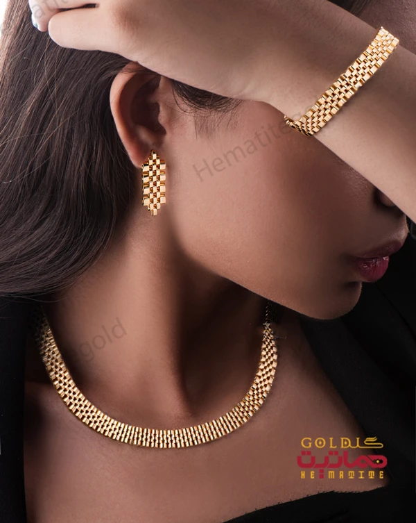 سرویس طلای رولکس سمانه شامل گردنبند، دستبند و گوشواره با طراحی منحصر به فرد در هماتیت گلد